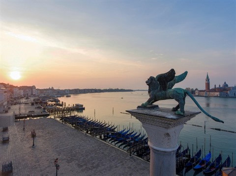 | Photo aérienne du Lion de Venise, qui surplombe une ville exceptionnellement vidée de ses touristes en raison du confinement, le 25 avril. |