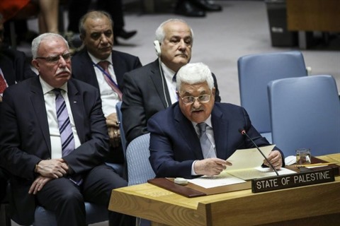| Le président palestinien Mahmoud Abbas au Conseil de sécurité de l'ONU à New York, le 20 février. |