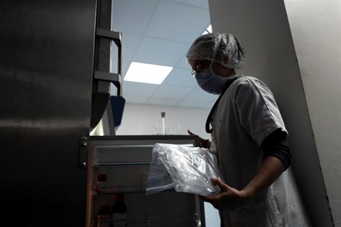 | Une pharmacienne tient une poche contenant une solution de phages, le 8 mars 2019 à l'hôpital de Bron, près de Lyon. |