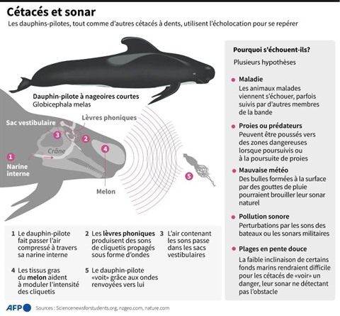 | Infographie sur la manière dont les dauphins-pilotes utilisent l'écholocation pour se repérer. |