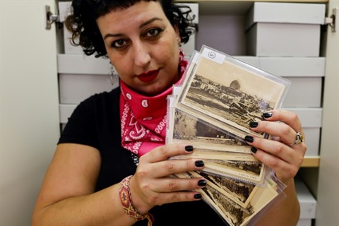 | Sachar Knaani, chercheuse à l’Université hébraïque, tient des cartes de la collection "Cartes postales de la Palestine" à l’Université de Jérusalem, le 24 septembre. |