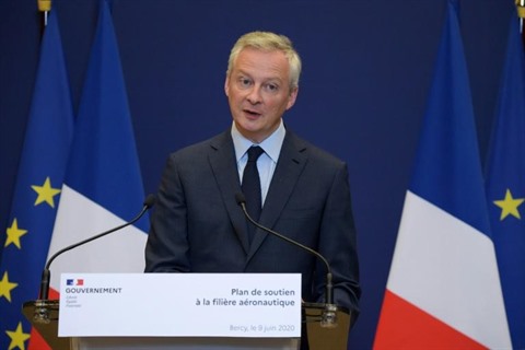 | Le ministre français de l'Économie, Bruno Le Maire, présente le plan de soutien à la filière aéronautique, le 9 juin à Paris. |