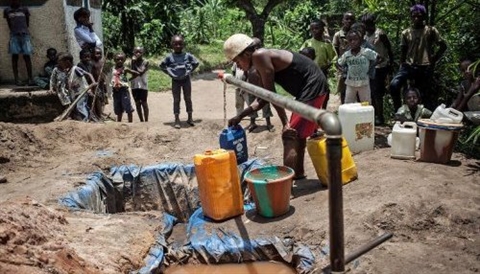| Des habitants de Kinshasa pompent de l'eau depuis le sol. |