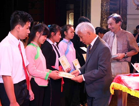| Les professeurs Trân Thanh Vân (aux cheveux blancs) et Odon Vallet remettent des bourses aux élèves et lycéens brillants, le 23 août à Hanoi. |