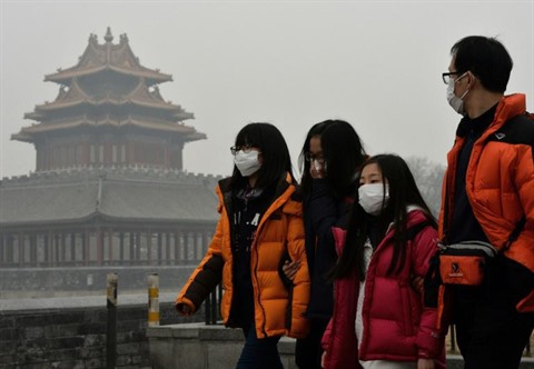 | Des touristes chinois portent un masque alors qu'ils marchent près de la Cité intredite à Pékin en 2014. |