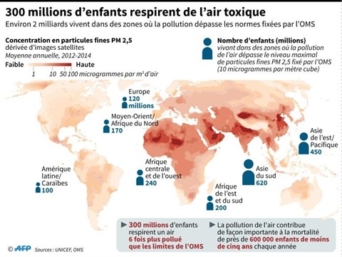 "La pollution de l'air contribue de façon importante à la mortalité de quelque 600.000 enfants de moins de cinq ans annuellement et menace la vie et l'avenir de millions d'autres", déplore le directeur général de l'UNICEF, Anthony Lake.