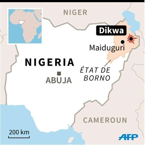 | Localisation du camp de déplacé de Dikwa, dans le nord-est du Nigeria où un double attentat suicide a fait au moins 35 morts. |