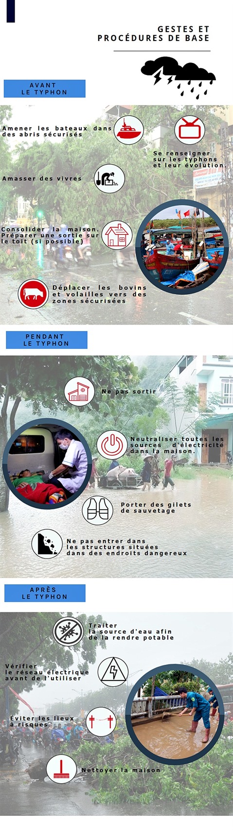 À la saison des typhons et des inondations, les habitants sont confrontés à de nombreux périls. Connaître les gestes et procédures de base pour éviter les accidents et les pertes humaines et matérielles s’avère nécessaire.
