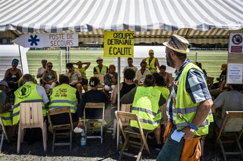| Des "gilets jaunes" rassemblés à Montceau-les-Mines en Saône-et-Loire le 29 juin 2019. |