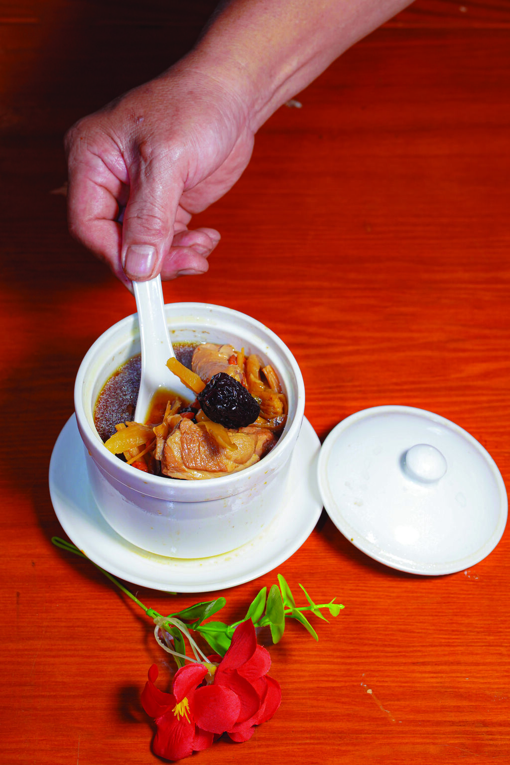 Pour diversifier l’expérience culinaire, vous pourrez aussi déguster du porc aux chrysanthèmes et herbes médicinales chinoises, un plat à la fois savoureux et riche en nutriments. Le jarret de porc est mijoté dans des herbes chinoises et est maintenu au chaud sous le couvercle d’une casserole en céramique.