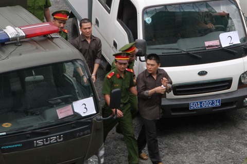 | Nguyên Duc Sinh (à l'avant, à droite) est escorté par des policiers. |
