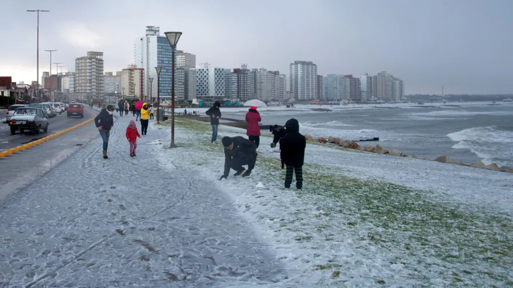 | Des gens jouent avec de la neige dans la ville de Miramar en Argentine, le 30 juin. |