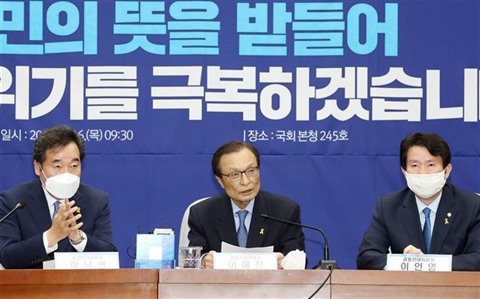 | Lee Hae-chan (centre), chef du Parti démocrate (PD) au pouvoir, et des responsables de son parti, lors d'une conférence de presse à Séoul le 16 avril. |