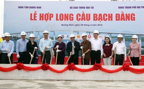 | La présidente de l'AN, Nguyên Thi Kim Ngân, (5e à gauche), lors de la cérémonie de raccordement des tabliers du pont de Bach Dang, le 28 avril à Quang Ninh (Nord). |