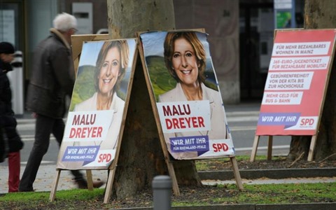 | Panneaux électoraux pour Malu Dreyer, dirigeante social-démocrate sortante de la Rhénanie-Palatinat, à Mainz, dans l'Ouest de l'Allemagne, le 14 mars, jour de l'élection régionale. |