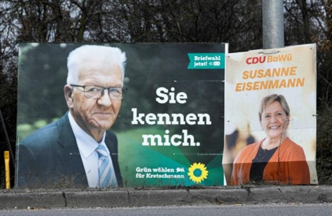 | Affiches électorales pour les élections régionales au Bade-Wurtemberg, à Stuttgart dans le Sud-Ouest de l'Allemagne, le 9 mars. |