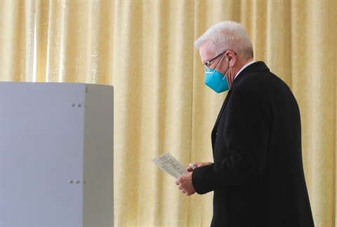 | L'écololgiste Winfried Kretschmann, à la tête du Bade-Wurtemberg, dans le Sud-Ouest de l'Allemagne, s'apprête à voter, le 14 mars à Sigmaringen. |