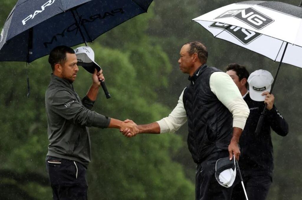 | Poignée de mains entre Tiger Woods (droite) et Xander Schauffele avant la reprise du 2e Tour au Masters d'Augusta, le 8 avril. |