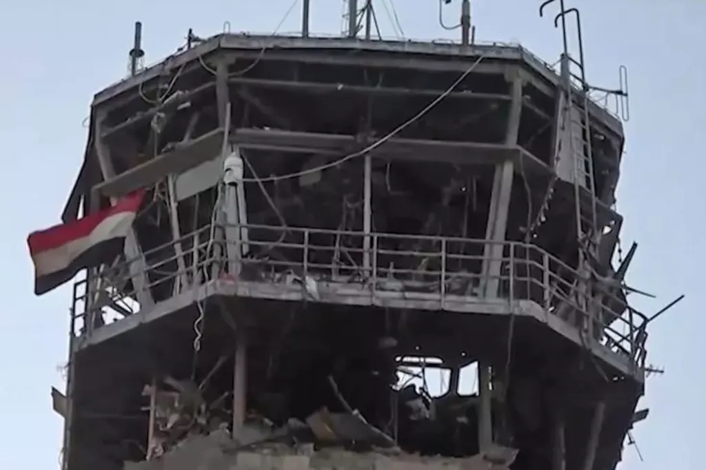 | Les dégâts subis par la tour de contrôle de l'aéroport de Sanaa à la suite des frappes israéliennes, le 26 décembre, image extraite d'une vidéo fournie par la chaîne de télévision officielle Al-Masirah des Houthis du Yémen. |