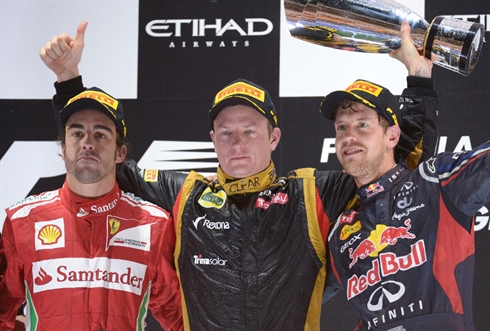 | Fernando Alonso (gauche), Kimi Räikkönen (centre) et Sebastian Vettel, le 4 novembre sur le podium du Grand Prix d'Abou Dhabi. Photo : AFP/VNA/CVN |