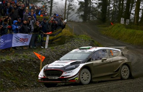 | Le Britannique Elfyn Evans (M-Sport/Ford) lors de la 13e spéciale du rallye de Grande-Bretagne, le 28 octobre 2017 à Machynlleth. |