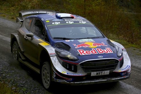 | Le Français Sébastien Ogier (M-Sport/Ford) lors de la 11e spéciale du Rallye de Grande-Bretagne, le 28 octobre 2017. |