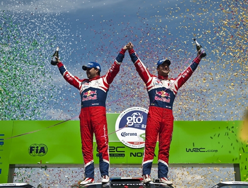 | Sébastien Loeb (droite) et son co-équipier Daniel Elena fête leur 6e victoire consécutive le 11 mars au rallye du Mexique. Photo : AFP/VNA/CVN |