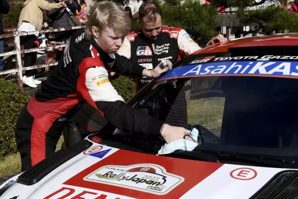| Le Finlandais Kalle Rovanperä (Toyota) essuie le pare-brise de sa voiture au point de regroupement avant la 22e spéciale du Rallye WRC du Japon, dans la ville de Toyota, le 19 novembre 2023. |