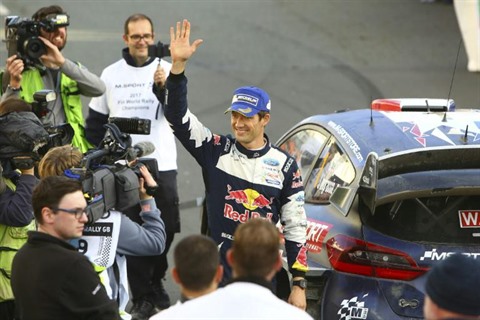 | Le pilote français Sébastien Ogier sacré champion du monde pour la cinquième fois après sa troisième place au rallye de Grande-Bretagne, le 29 octobre à Llandudno, au pays de Galles. |