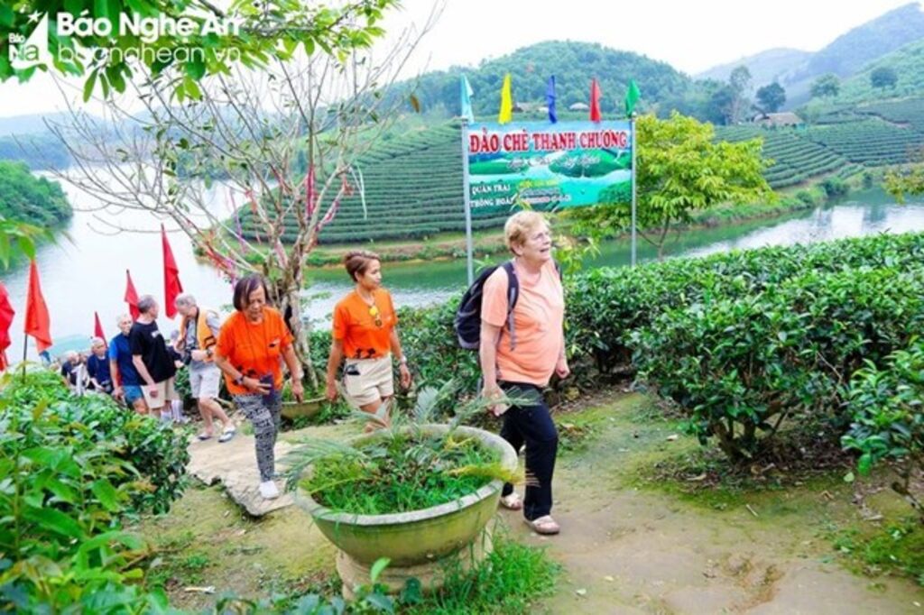 Après avoir terminé deux parcours de marathons à la Réserve naturelle de Pù Mat dans le districts de Con Cuông, sur le chemin du retour vers la ville de Vinh, un groupe de touristes français ont visité et découvert des îlots de thé dans le district de Thanh Chuong, considérés comme "la baie de Ha Long terrestre".