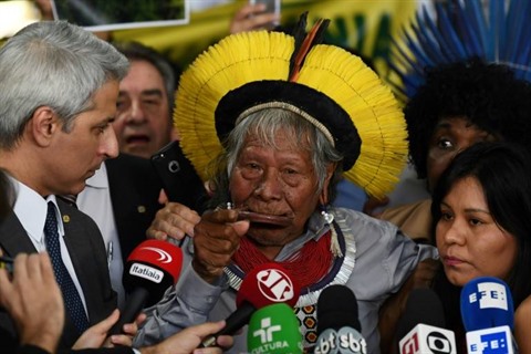 | Le chef indigène brésilien Raoni, photographié lors d'une conférence de presse à Brasilia le 25 septembre. |