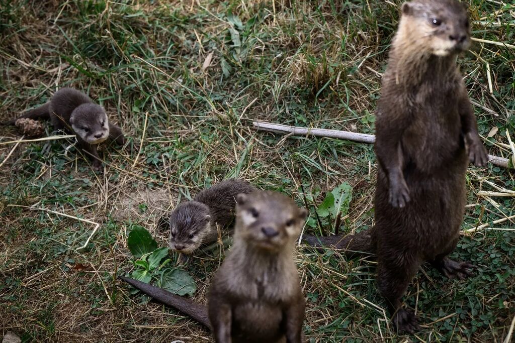 | Des loutrons de deux mois près de leur mère au Parc animalier d'Auvergne, le 17 août à Ardes, dans le Puy-de-Dôme. |