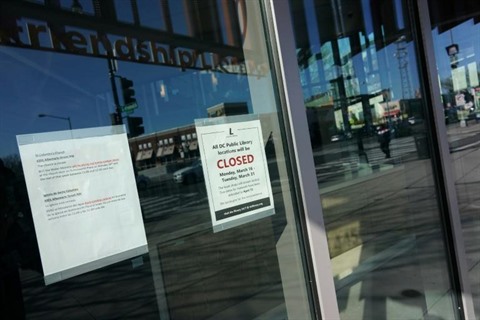 | Un panneau de fermeture scotchée sur la porte d'entrée de la bibliothèque publique de Tenley/Friendship à Washington, DC, le 16 mars. |