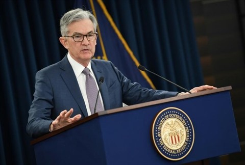 | Le président de la Fed Jerome Powell lors d'une conférence de presse, le 3 mars 2020 à Washington. |