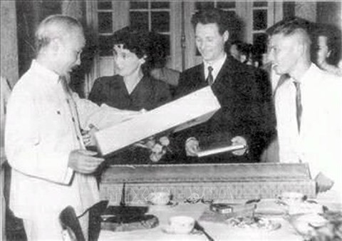 | Le Président Hô Chi Minh recevant Raymonde Dien et Henri Martin à Hanoi, en novembre 1956. |