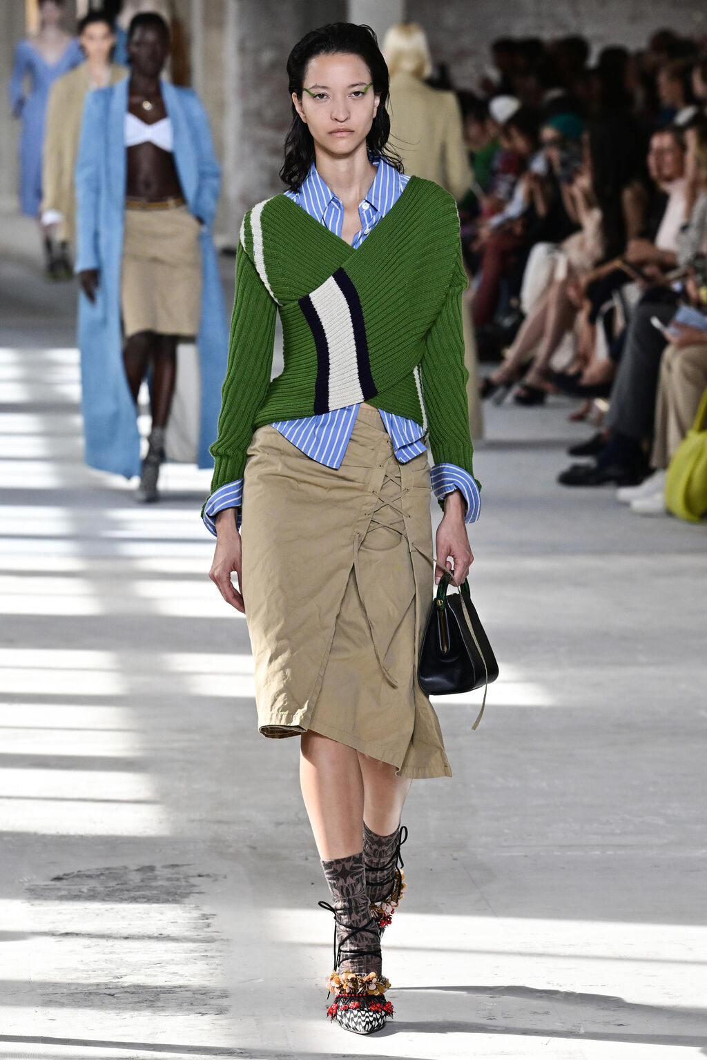 Les codes sont inspirés du sportswear des années 20, mais "tout est chamboulé". On retrouve les rayures sur des robes asymétriques, les écharpes de tennis se transforment en hauts tricotées et se retrouvent retravaillées dans le drapé d'une jupe.