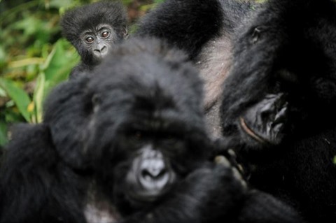 | Un bébé gorille de montagne apparaît derrière deux femelles adultes sur les pentes d'un volcan éteint du Parc national des Virunga, dans l'Est de la République démocratique du Congo. |