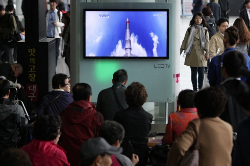 | Des habitants sud-coréens regardent le lancement d'une fusée nord-coréenne, le 13 avril à Séoul. |