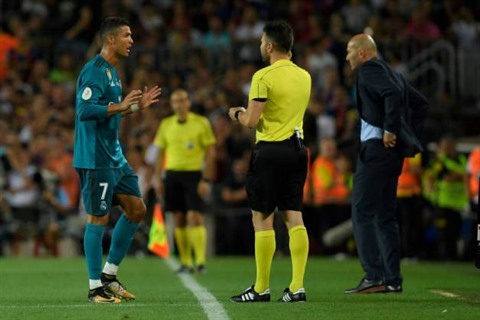 | L'attaquant du Real Madrid Ronaldo (gauche) quitte le terrain après un second carton jaune en match aller de Supercoupe d'Espagne, le 13 août. |