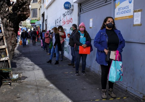 | Des personnes font la queue devant un supermarché avant le début du confinement, le 12 juin 2020 à Valparaiso, au Chili. |