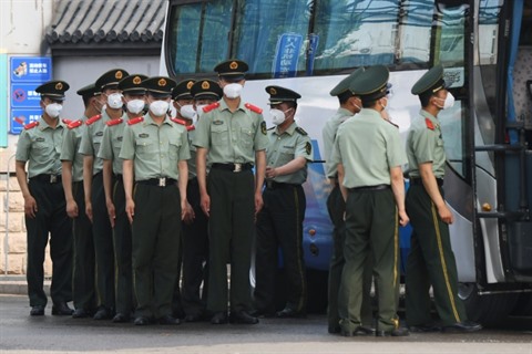 | Des policiers chinois s'apprêtent à boucler les accès au marché Xinfadi de Pékin, le 13 juin 2020. |