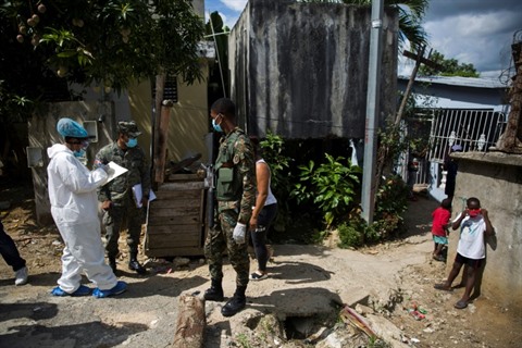 | Un soldat monte la garde pendant qu'un employé du ministère de la Santé effectue des tests du coronavirus à San Cristobal, en République dominicaine, le 13 juin 2020. |