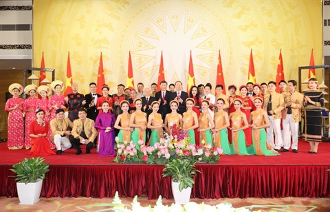 | Le secrétaire général du Parti communiste chinois (PCC) et président chinois Xi Jinping, le secrétaire général du Parti communiste du Vietnam, Nguyên Phu Trong, et le président vietnamien Trân Dai Quang prennent la photo avec les artistes lors de la réception solennelle du 12 novembre. |