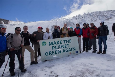 | Des ambassadeurs de l'UE lancent un appel à lutter contre le réchauffement climatique, le 29 juin 2017 au pied d'un glacier en Équateur. |