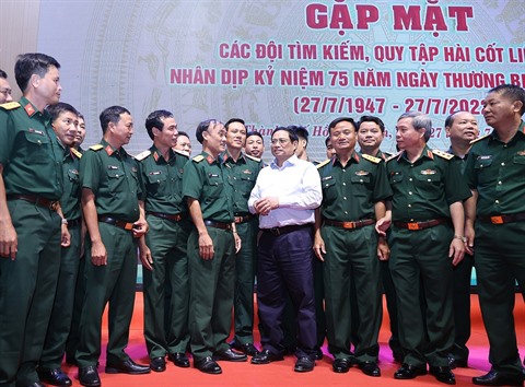| Le Premier ministre Pham Minh Chinh (chemise blanche) lors de la rencontre avec les membres des équipes de recherche et de rassemblement des restes des martyrs, le 27 juillet à Hô Chi Minh-Ville. |