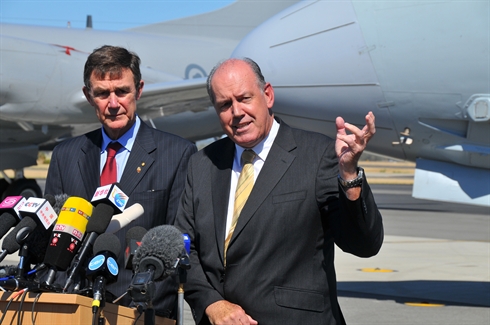 | Le chef du JACC, Angus Houston (gauche), et le ministre de la Défense australien David Johnston, lors d'une conférence de presse le 8 avril en Australie. |