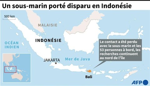 Le submersible de fabrication allemande, le KRI Nanggala 402, devait participer mercredi à des manoeuvres incluant le tir de torpilles. Il avait demandé l'autorisation de plonger tôt mercredi matin 21 avril et le contact avec le sous-marin a été perdu peu après. Plusieurs pays ont offert leur aide, dont les États-Unis, l'Australie, la France et l'Allemagne.