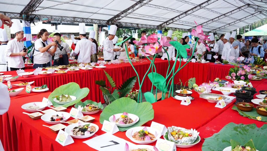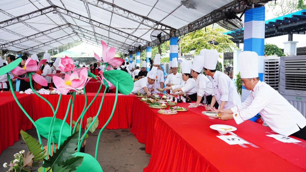| Scène de chefs préparant 200 plats végétariens à base de lotus et de produits agricoles vietnamiens. |