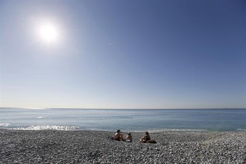 | Des vacanciers profitent de la chaleur sur une plage de Nice, le 7 mars. |