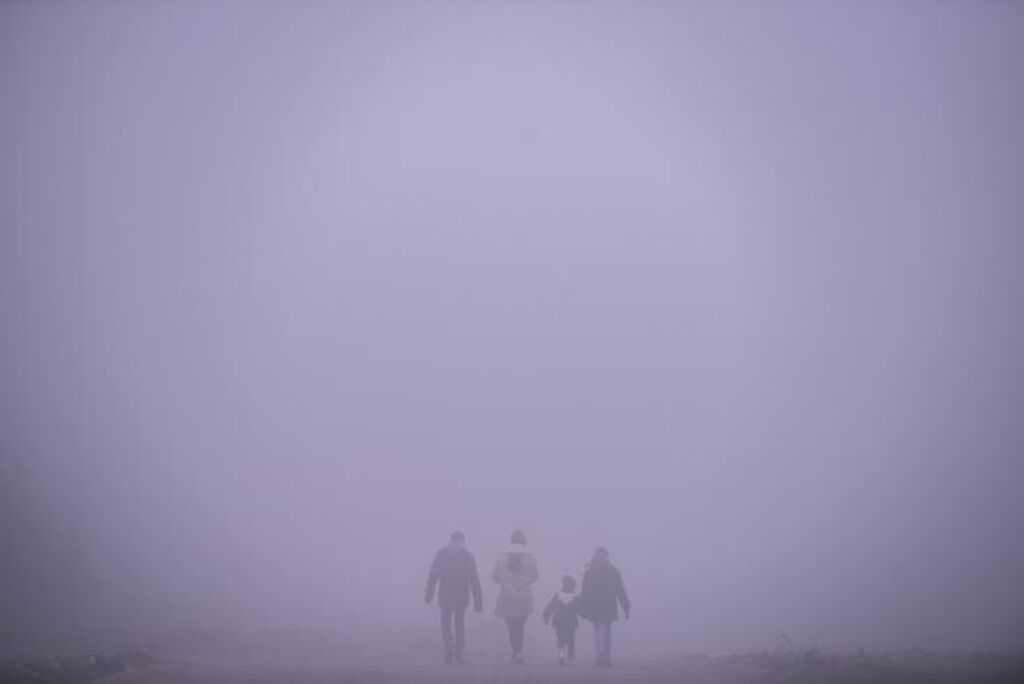 | Quatre personnes marchent près de Pristina au moment où la capitale du Kosovo connaît un fort taux de pollution, le 9 janvier 2022. |